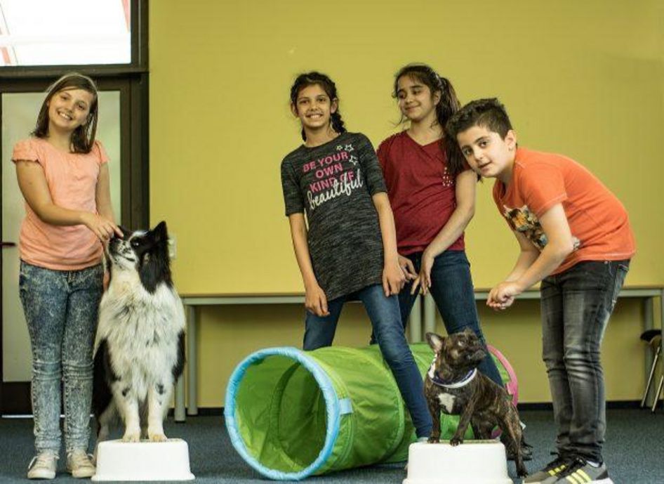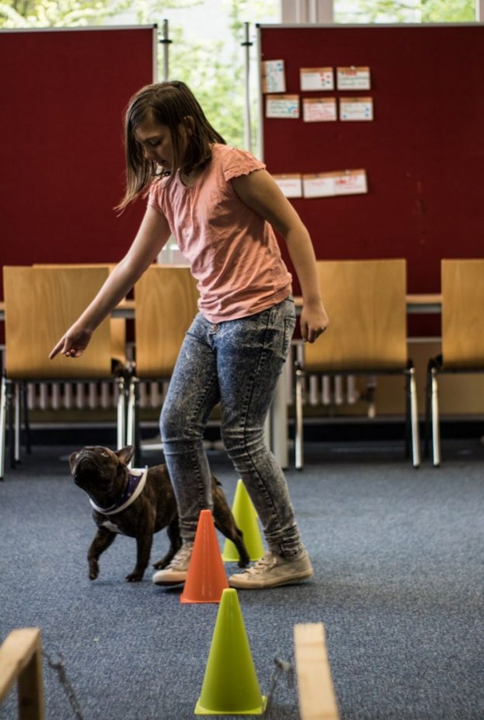 In der AG lernen die Schülerinnen und Schüler wie man uns Tricks beibringen kann. Zudem erklären unsere Frauchen den Kids unsere „Sprache“. Wir lernen besonders gut über die menschliche Körpersprache. Dabei spielen Handzeichen und auch die Körperhaltung der Menschen eine besondere Rolle. Mit dem passenden Wortsignal verstehen wir, was von uns verlangt wird.